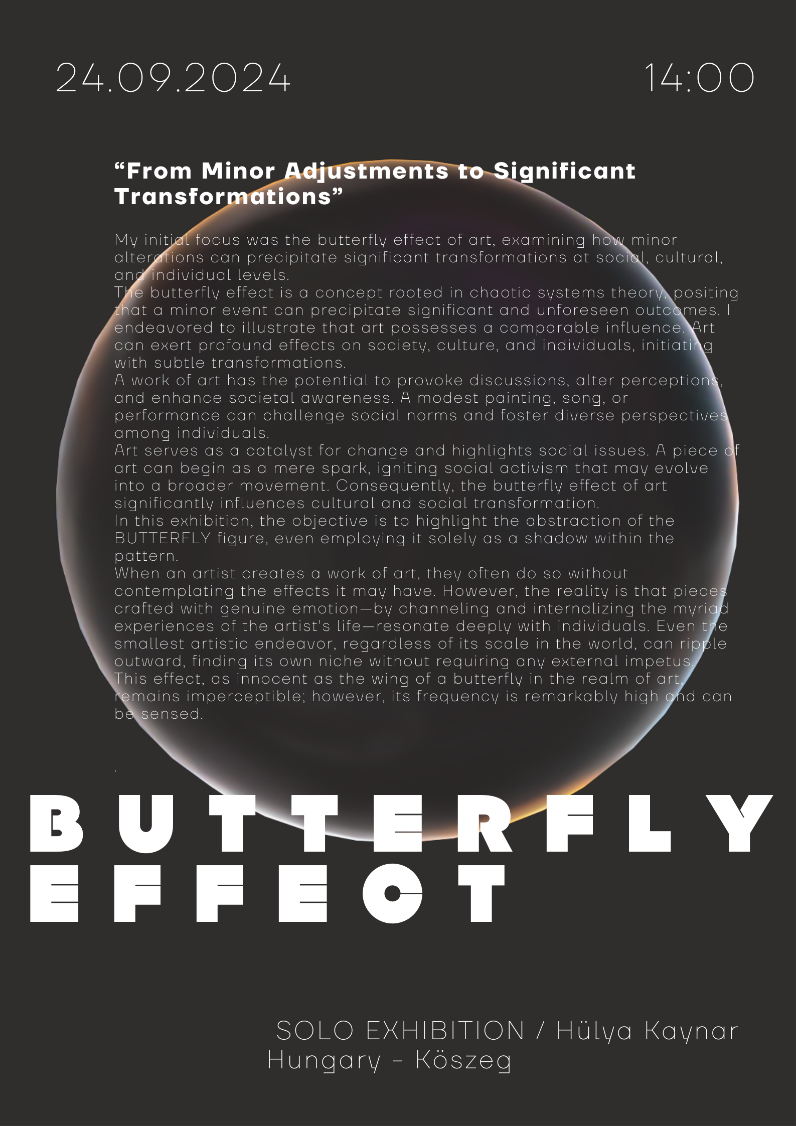 Mimarlık, Güzel Sanatlar ve Tasarım Fakültesi Görsel Sanatlar Bölümü üyemiz Doç. Dr. Hülya KAYNAR'ın "Butterfly Effect" konulu sergisi 24.09.2024 tarihinde açılacaktır.