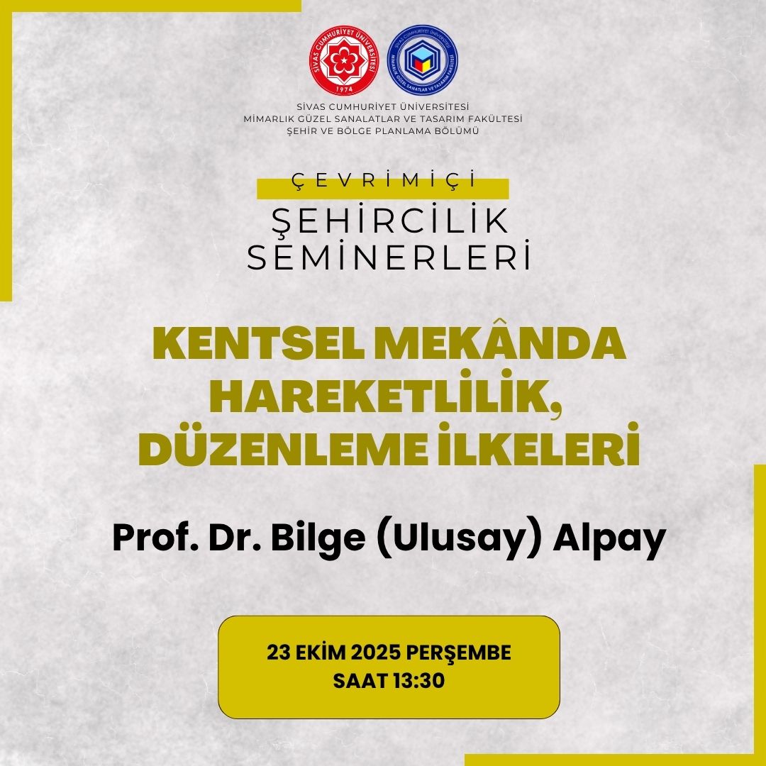 Mimar Sinan Güzel Sanatlar Üniversitesi Şehir ve Bölge Planlama Bölümü Öğretim Üyesi Prof. Dr. Bilge (Ulusay) Alpay tarafından “Kentsel Mekânda Hareketlilik, Düzenleme İlkeleri” konulu seminer gerçekleştirecektir.