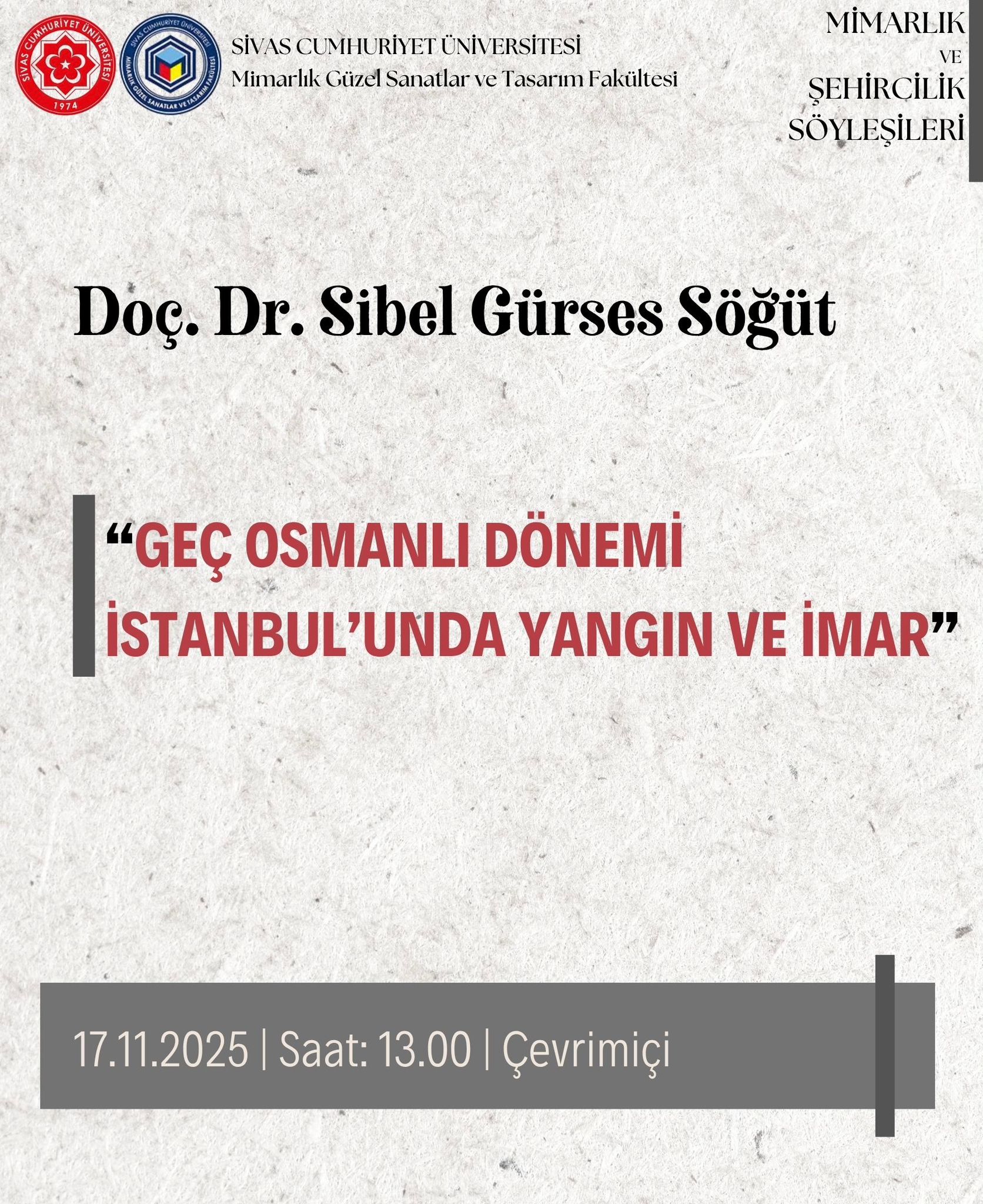 Mimar Sinan Güzel Sanatlar Üniversitesi Mimarlık Fakültesi Şehir ve Bölge Planlama Bölümü Öğretim Üyesi Doç. Dr. Sibel Gürses Söğüt ile “Geç Osmanlı Dönemi İstanbul’unda Yangın ve İmar” konulu bir söyleşi gerçekleştirilecektir.