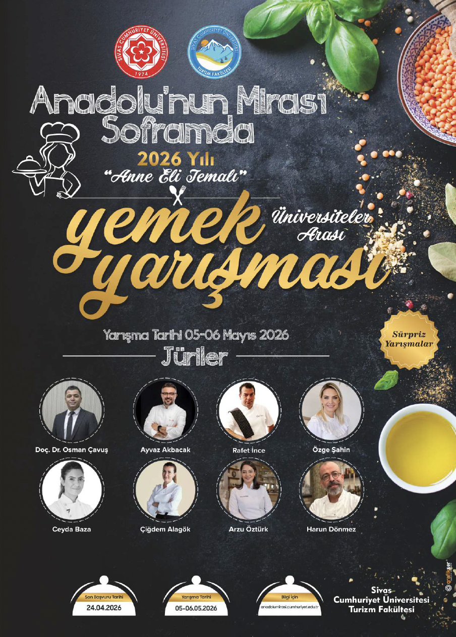 Turizm Fakültesi tarafından 05-06 Mayıs 2026 tarihlerinde "Anadolu'nun Mirası Soframda Üniversiteler Arası Yemek Yarışması" düzenlenecektir (anadolumirasi.cumhuriyet.edu.tr), "Anne Eli" temasıyla, üniversitelerin Aşçılık ile Gastronomi ve Mutfak Sanatları Bölümü öğrencilerinin katılımıyla gerçekleştirileceği belirtilen yarışmada, çeşitli söyleşi ve sürpriz yarışmalar yer alacaktır.