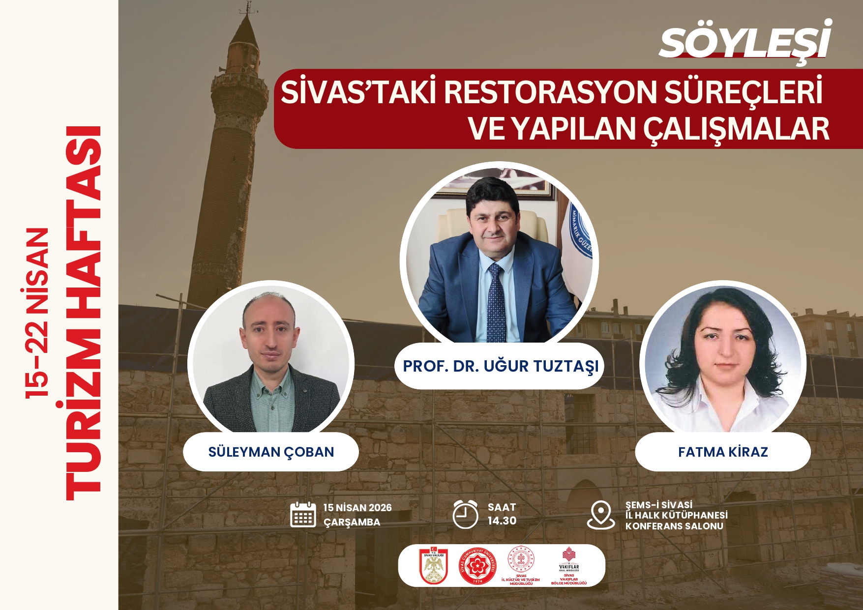 Turizm Haftası etkinlikleri kapsamında Dekanımız Prof. Dr. Uğur Tuztaşı moderatörlüğünde "Sivas'taki Restorasyon Süreçleri ve Yapılan Çalışmalar" konulu söyleşi düzenlenecektir.