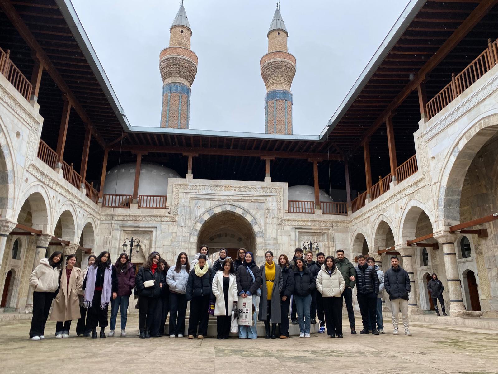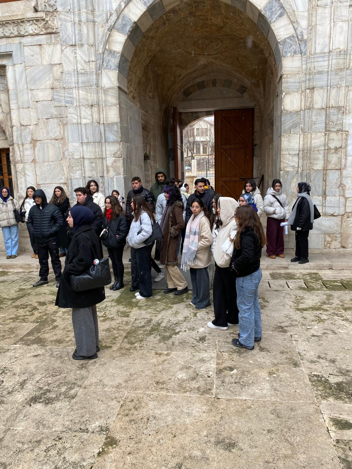 Mimarlık, Güzel Sanatlar ve Tasarım Fakültesi 1. sınıf öğrencilerimiz için düzenlenen etkinlik serisinin üçüncüsü Gökmedrese Vakıf Müzesi ziyareti ile tamamlandı. Müze müdürü Rukiye Şahan tarafından Gök Medrese, mimari, süsleme ve sanat tarihi bağlamında detaylı şekilde tanıtıldı. Müzenin bölümlerinin öğrenciler tarafından incelenmesiyle etkinlik tamamlandı.
