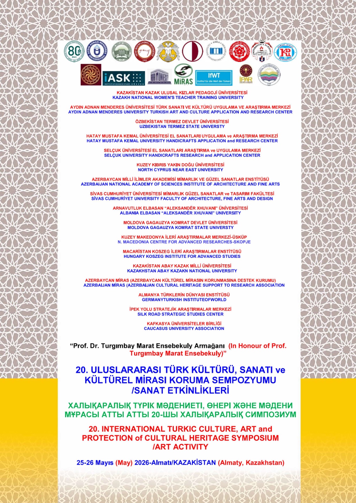 Türk dünyasının ortak kültürel mirasını korumak, sanat ve bilimin ışığında geleceğe taşımak amacıyla düzenlenen büyük organizasyon için geri sayım başladı. 25-26 Mayıs 2026 tarihlerinde Kazakistan’ın Almatı şehrinde gerçekleştirilecek olan “20. Uluslararası Türk Kültürü, Sanatı ve Kültürel Mirası Koruma Sempozyumu ve Sanat Etkinlikleri”, dünya genelinden pek çok saygın üniversite ve kurumu bir araya getiriyor.